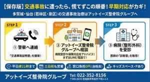 事故直後は誰しもが動揺し、何をすべきか分からなくなるものです。アットイーズ整骨院グループでは、患者様が不利益を被らないよう、以下の手順を推奨しております。